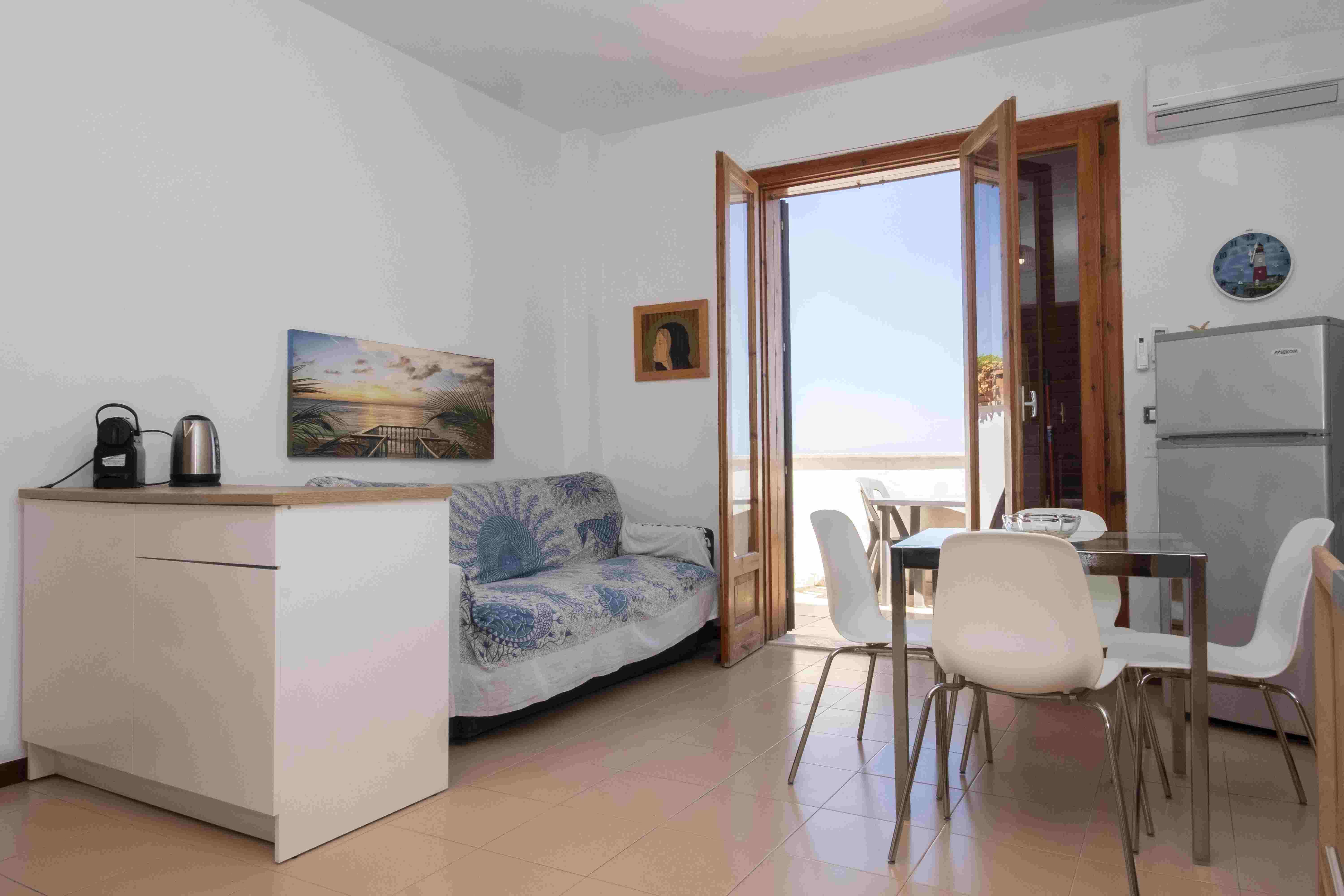 Apartment Coryna has a sea-view balcony and a wonderful location in San Vito Lo Capo. Our apartment Coryna, in San Vito Lo Capo, is accessed by a staircase which leads to the entrance on the first floor. Here we find a kitchen, a living room, a double bedroom, a bathroom with shower, a sofa bed in the living room